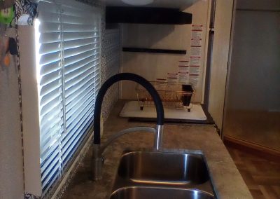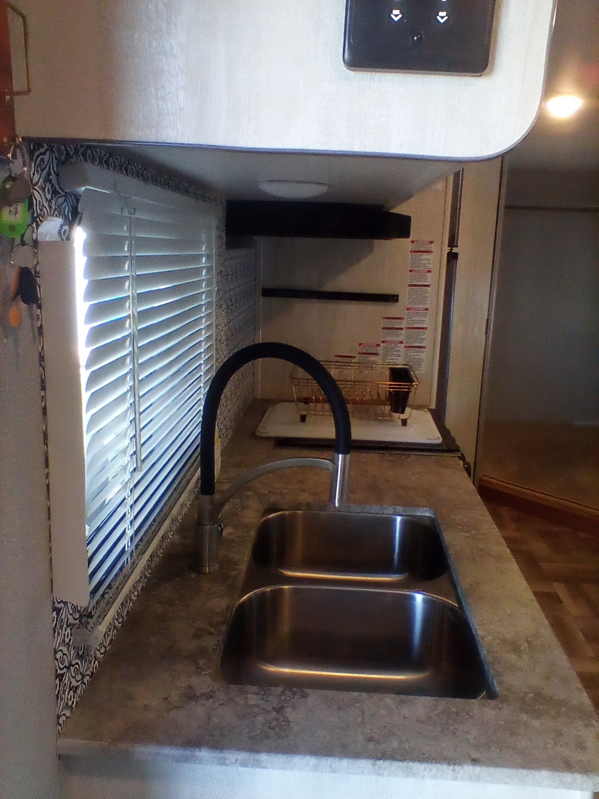- New kitchen farmhouse sink, countertops, and backsplash have been put in