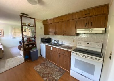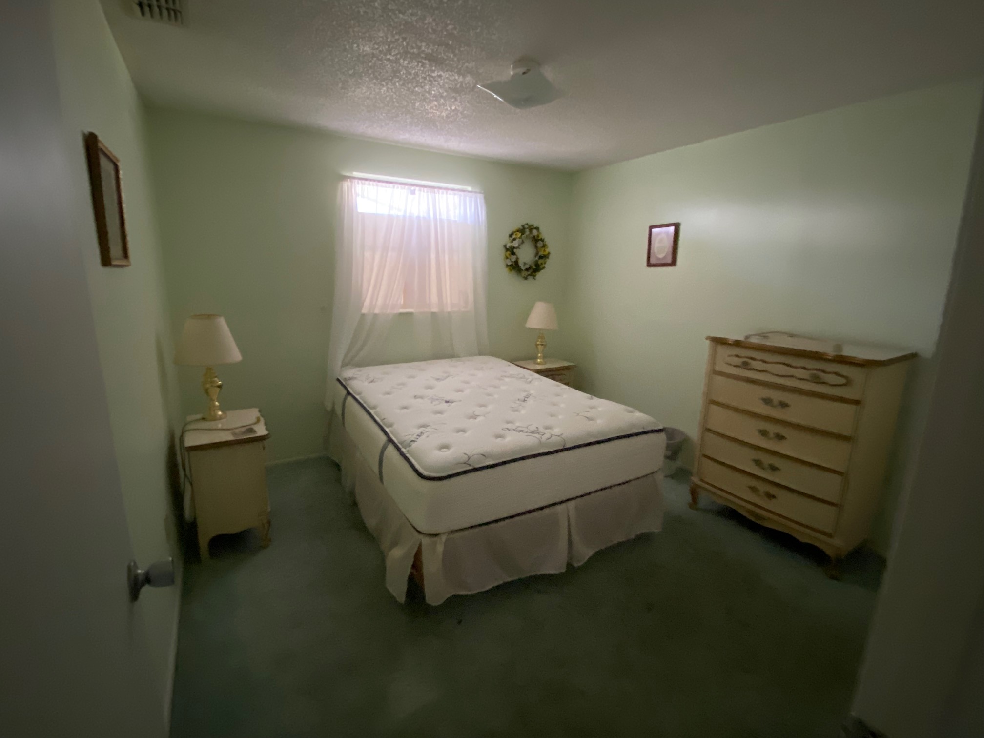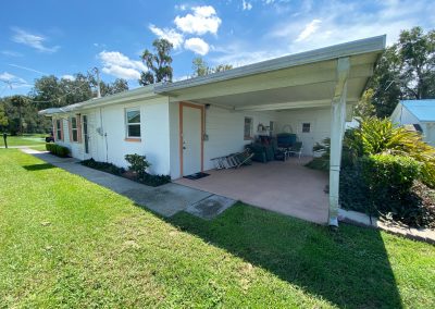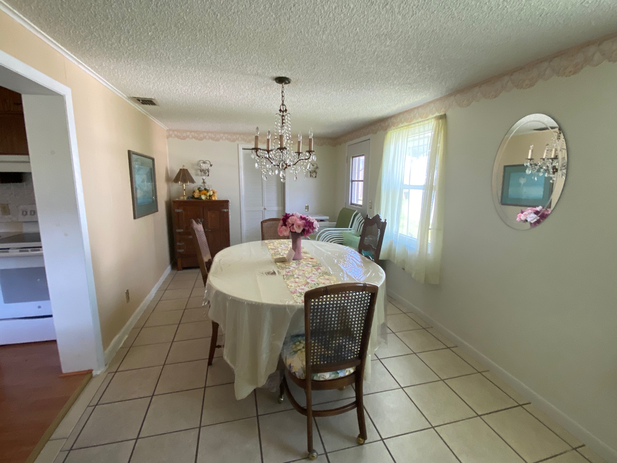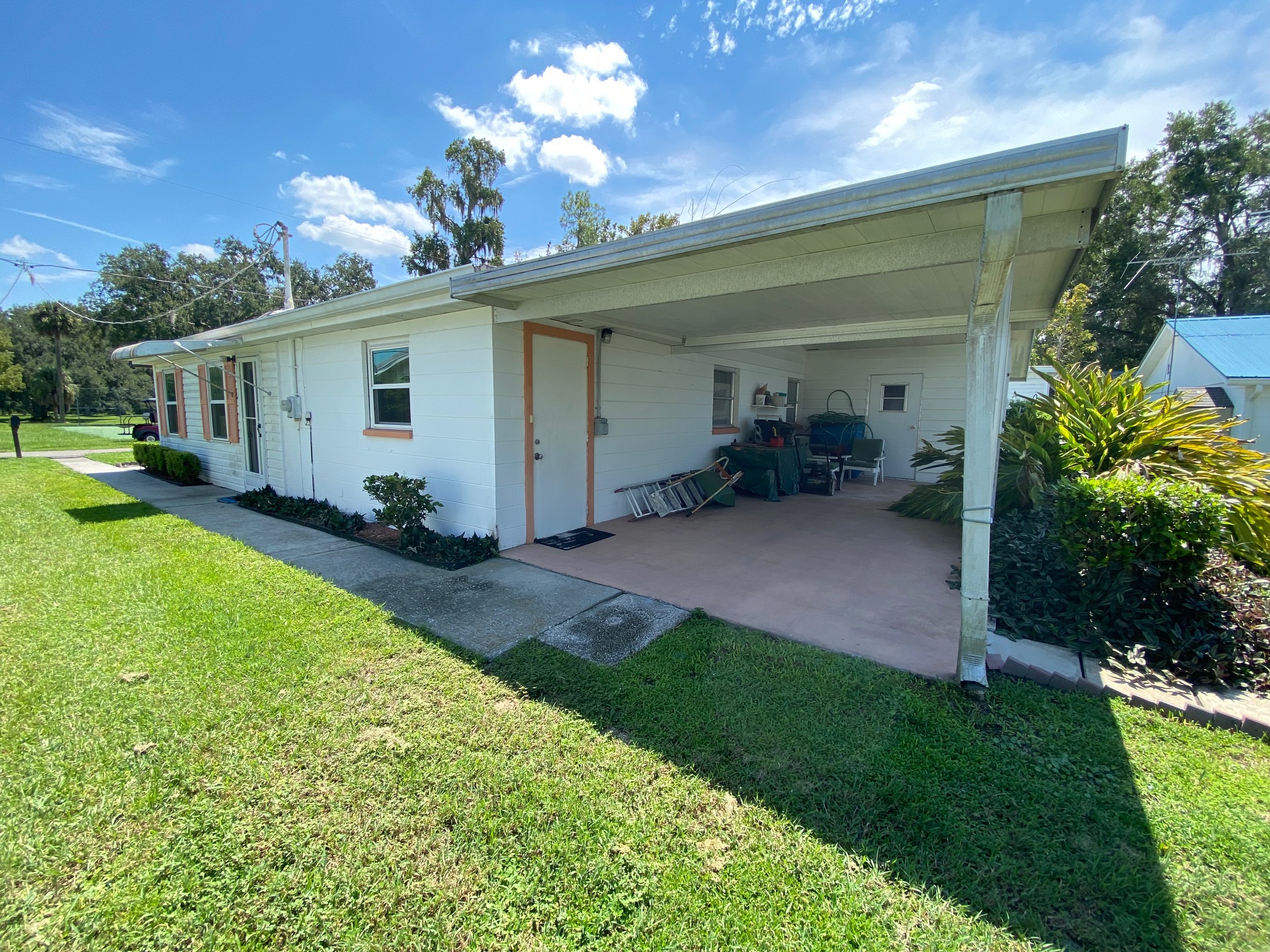 Berber carpet in living room and master bedroom, regular carpet in second bedroom and tile floors throughout the rest of the house. Included are two full baths, stacked washer and dryer in utility room, attached shed, small front porch facing tennis courts, large fairly private back porch and whole house generator. Many windows are tilt ins and only a few years old. It has a foam roof which was replaced in 2020 and repaired last year after after hurricane Milton. There is Samsung TV and pull out couch in living room and house is fully furnished with a lovely dining room set, linens, pots, pans and utensils. There is room for a carport or parking in rear.